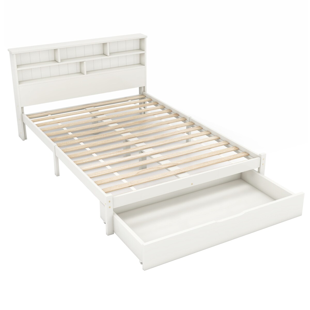 Merax Stauraumbett Doppelbett 140x200 Massivholzbett mit Schublade @ Kopfteil Bücherregal & Lattenrost Weiß