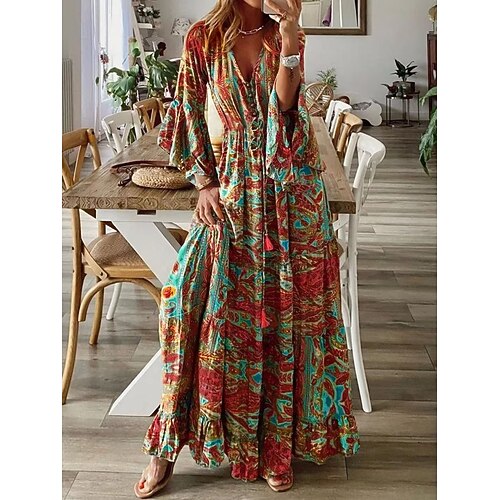 Per donna Vestito maxi Abito casual Moda Informale Da mare Giornaliero Standard Fantasia geometrica Manica a 3/4 A V Nero Vino Viola Verde Estate