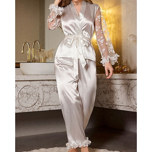 Per donna Accappatoio Casual Morbido Raso Colore Puro Pizzo Pantalone Quotidiano Casa Da letto Manica Lunga Scollo a V Nero Bianco Vino Rosso Marrone Estate Primavera Vestibilità regolare