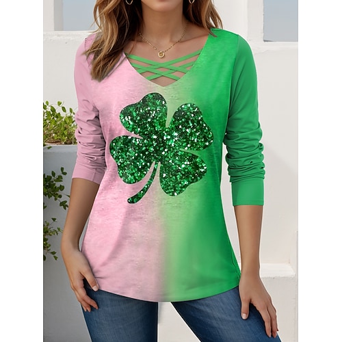 T-shirt da donna per San Patrizio casual a maniche lunghe colletto a V colletto regolare top quotidiani stampa a taglio verde primavera autunno