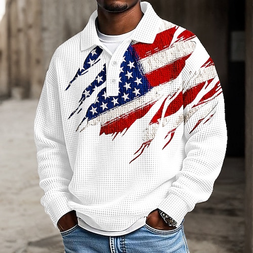 Giorno dell'Indipendenza Americana Per uomo Bandiera Americana Polo Testurizzato Manica Lunga Magliette polo Bavero Casual Athleisure Abbigliamento quotidiano Stampa 3D Primavera Autunno Inverno Blu