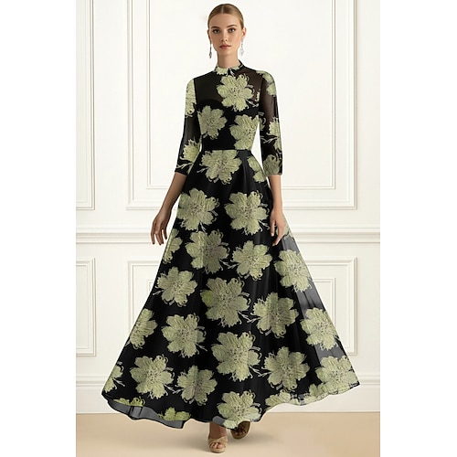 Linea ad A Lunghezza al pavimento Abito da Sera Abito formale Elegante Quotidiano Abiti semi formali Manica 3/4 Collo Alto Festa in giardino Matrimonio Organza Jacquard con Stampa floreale