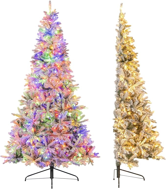 COSTWAY 180 cm künstlicher halber Weihnachtsbaum mit Lichtern und Schnee, Tanne mit 180 LED-Lichtern, 9 Modi, Fernbedienung
