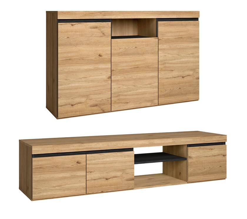 SKRAUT HOME Set Natural Wohn-Esszimmer, Zusatzmöbel, Buffet TV-Schrank 160cm Nordeiche schwarz _ SETNAT160