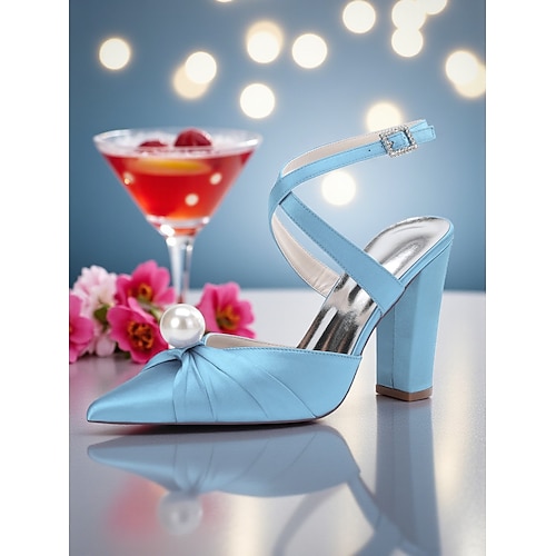 décolleté da donna con tacco a blocco in raso blu, dettagli in perle e cinturino alla caviglia - eleganti scarpe a punta per occasioni formali e cocktail party
