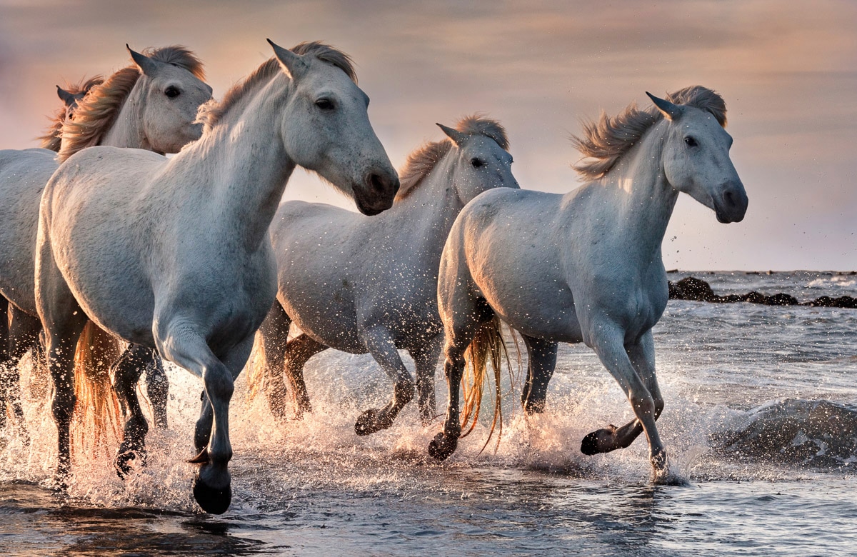 Fototapete PAPERMOON "PFERDE-CAMARGUE GALLOP STRAND MEER TIERE KÜSTE PROVENCE", bunt, B:4,50m L:2,80m, Vlies, Tapeten