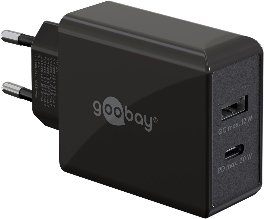 Goobay 61673 USB-C™ PD Dual-Schnellladegerät (30 W) schwarz, schwarz - 1x USB-C™-Anschluss (Power Delivery) und 1x USB-A-Anschluss