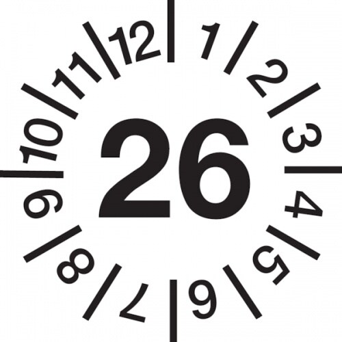 König Werbeanlagen Jahresprüfplaketten ab 26, Jahresfarben, Dokumentenfolie, Ø 10 - 30 mm - Bogen = 10 Plaketten - 10 mm Dokumentenfolie selbstklebend