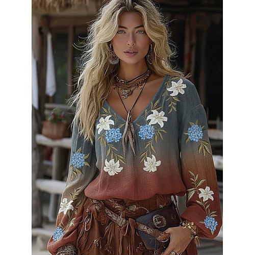Per donna Camicia Floreale Grafico Vintage Elegante Manica Lunga Scollo a V Top Regolari Giallo Rosa Blu marino Estate Primavera
