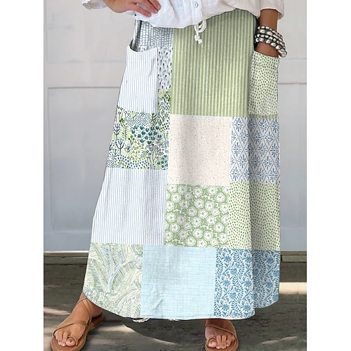 Per donna Gonna Casual Maxi Misura del girovita medio Gonne Floreale Patchwork Inelastico Quotidiano Vacanza Blu Verde Estate Poliestere