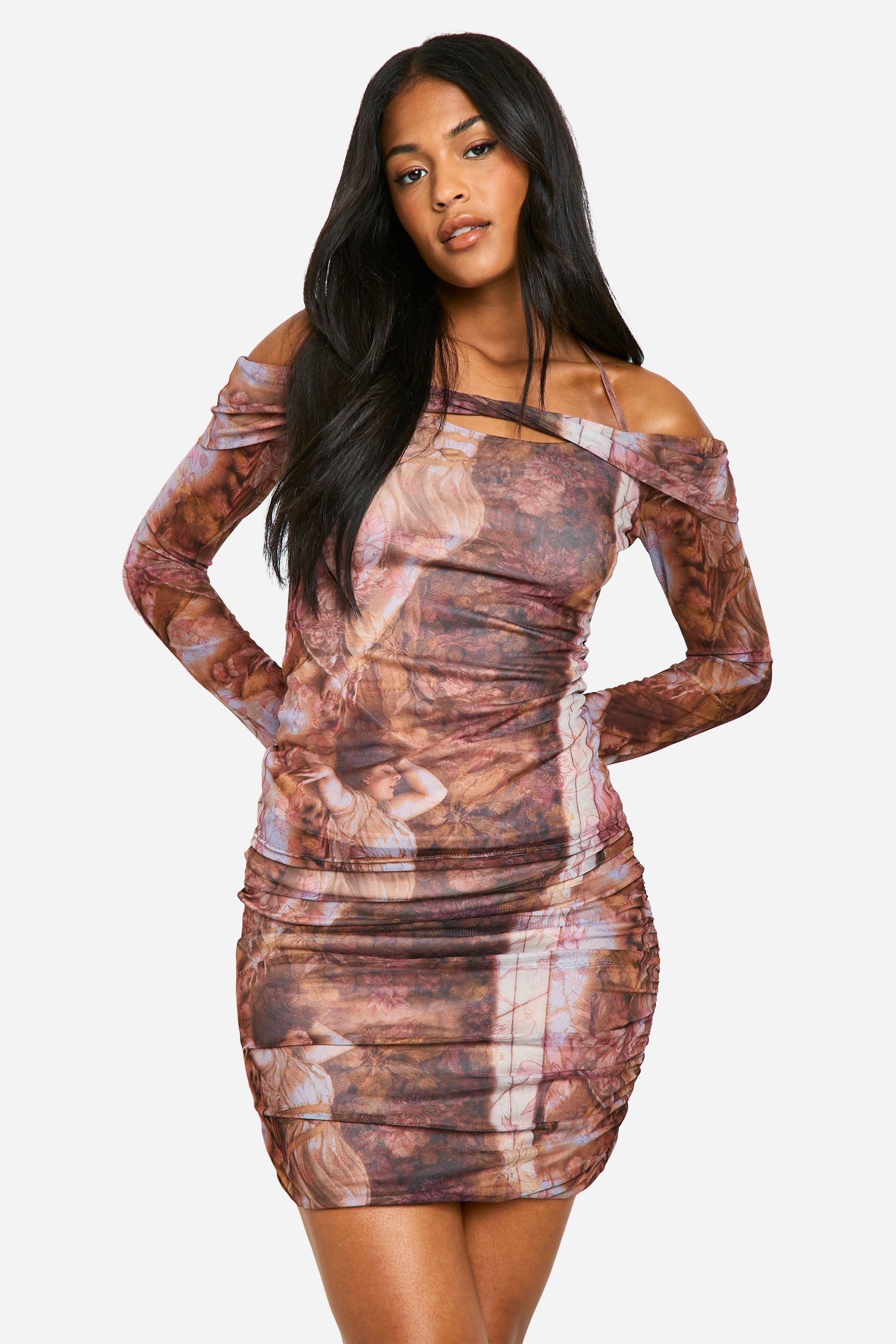 Boohoo Womens Tall Renaissance Print Ruched Mini Skirt - Chocolate - Size 8 UK | Boohoo Sale | Discount Designer Brands