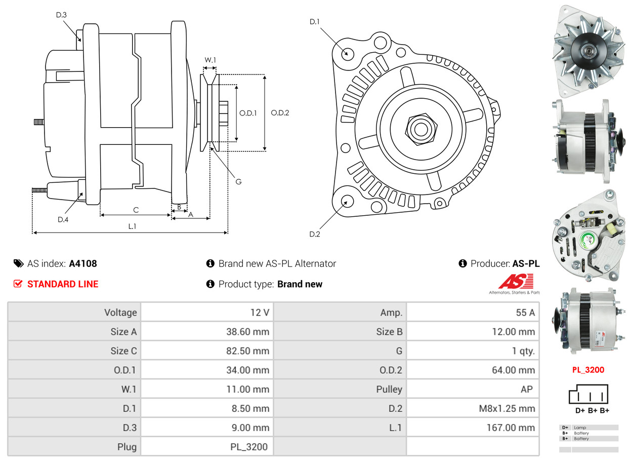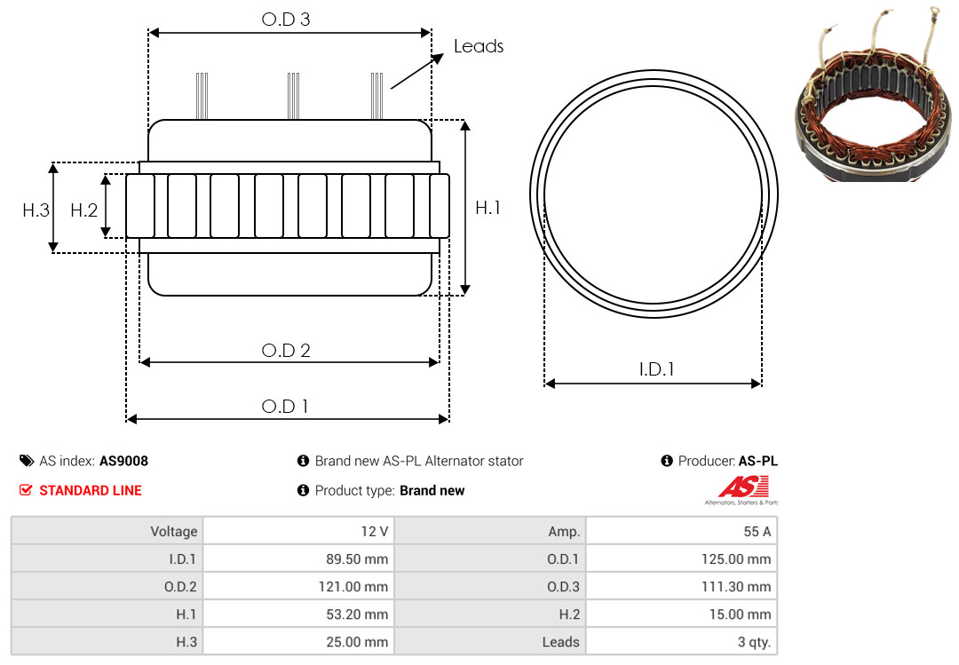 AS-PL Stator, Generator AS9008 Universal 12V 55A
