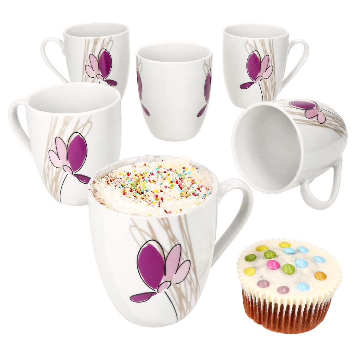 6er Set Viola Kaffeebecher 350ml Porzellan-Tassen 6 Personen Blumen Tee Kakao
