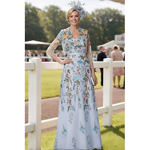 Linea ad A Lunghezza al pavimento Abito da invitata a nozze Abito da cerimonia per signora Manica 3/4 Scollo a Cuore Elegante Formale Derby del Kentucky Semi-Formale Pizzo Abiti Corti con Giacca con