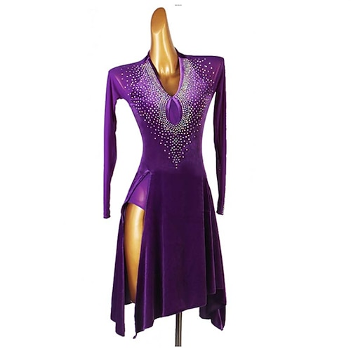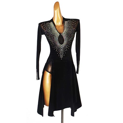 abito da ballo salsa latino con perline cristalli / strass paillettes performance da donna a maniche lunghe in rete chinlon