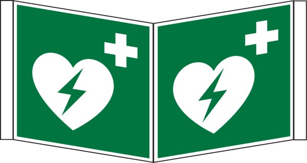 Rettungszeichen, Winkelschild Defibrillator E010 - ASR A1.3 (DIN EN ISO 7010) - 150x150x1 mm Kunststoff nachleuchtend