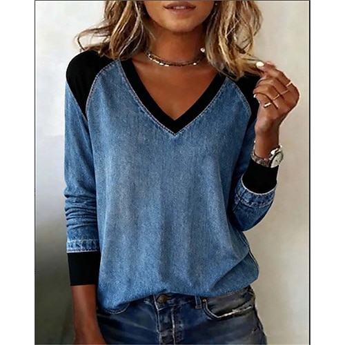 Per donna Blusa Top Eleganti Blocco di colori Semplice Elegante Vintage Signore Manica Lunga Scollo a V Top Regolari Lavoro Quotidiano Ferie Patchwork Blu Autunno Inverno