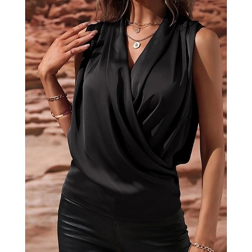 Per donna Camicia Elegant Raso/Satin Blusa Semplice Vintage Elegante Senza Maniche Scollo a V Top Regolari Quotidiano Ferie Uscire Arricciato Drappeggiato Nero Champagne Estate Primavera