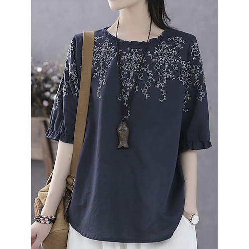 Per donna Blusa Floreale Elegante Casual Manica 3/4 Girocollo Top Regolari Quotidiano Ricamato Bianco Blu marino Estate Primavera