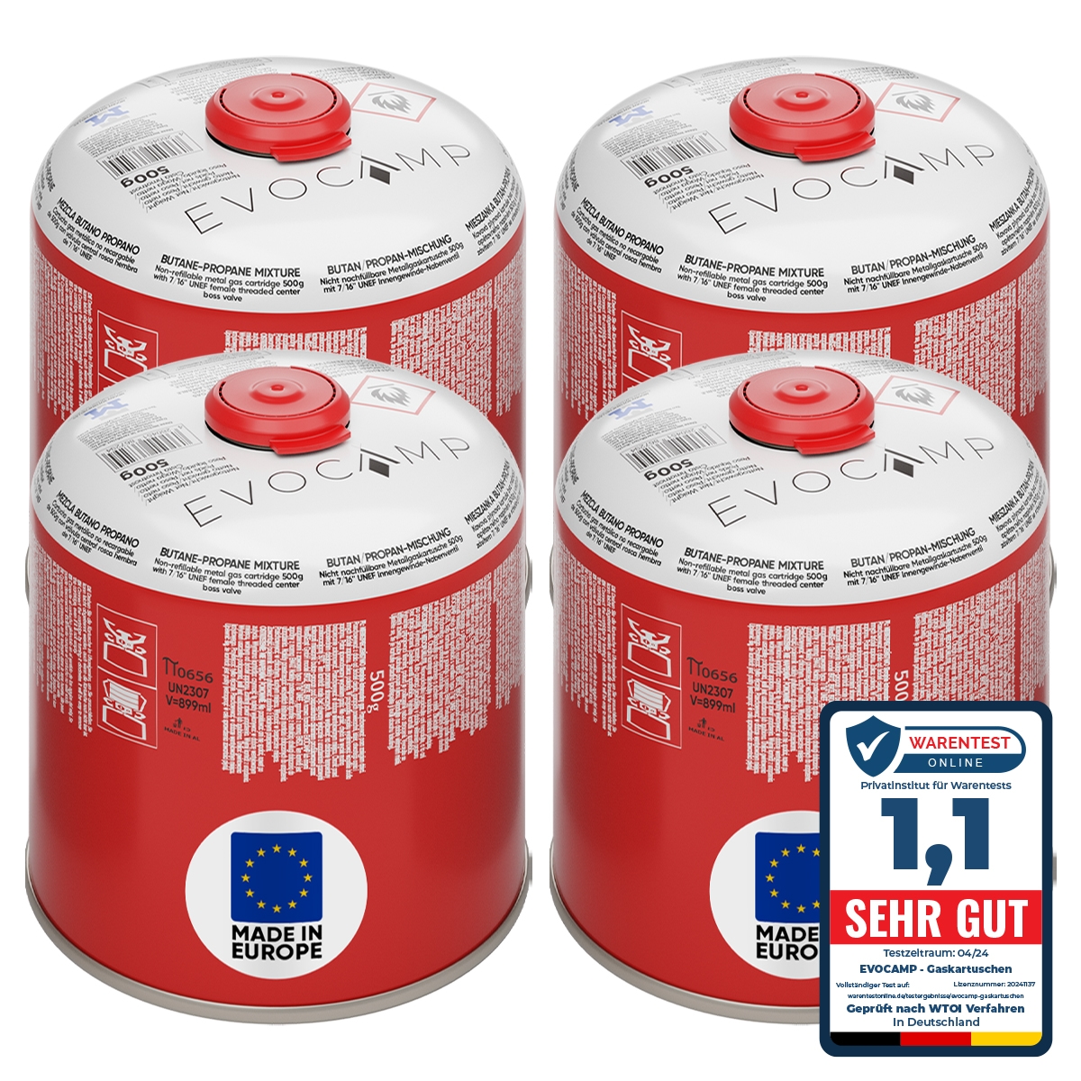 EVOCAMP 4x Gaskartuschen 500g mit Schraubventil Butan/Propan – Zuverlässige Energie für Gaskocher und Outdoor-Aktivitäten
