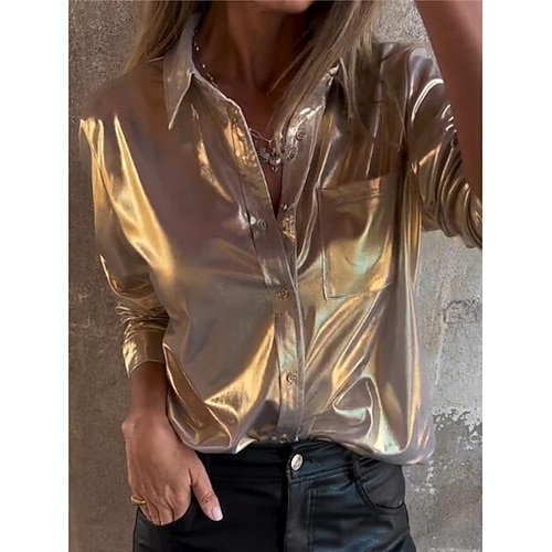 Per donna Camicia Elegant Top in raso Blusa Arricciato Bottoni Stampato Semplice Elegante Vintage Quotidiano Manica Lunga Colletto a Camicia Top Regolari Quotidiano Lavoro Ferie Argento Oro Autunno