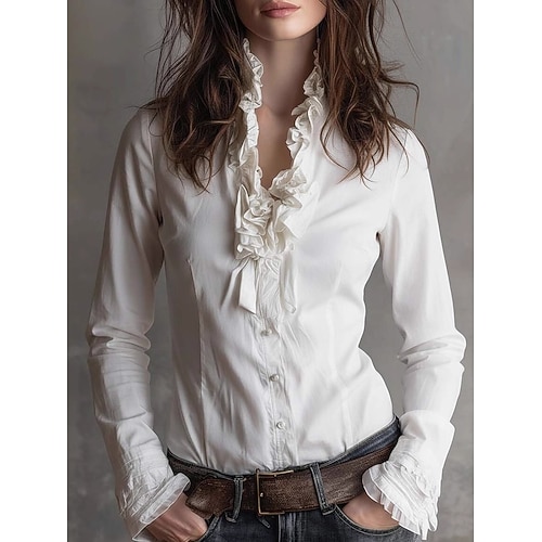 Per donna Camicia Camicia casual Semplice Vintage Elegante Essenziale Manica Lunga Scollo a V Top Regolari Quotidiano Ferie Uscire Bianco Estate Primavera Autunno