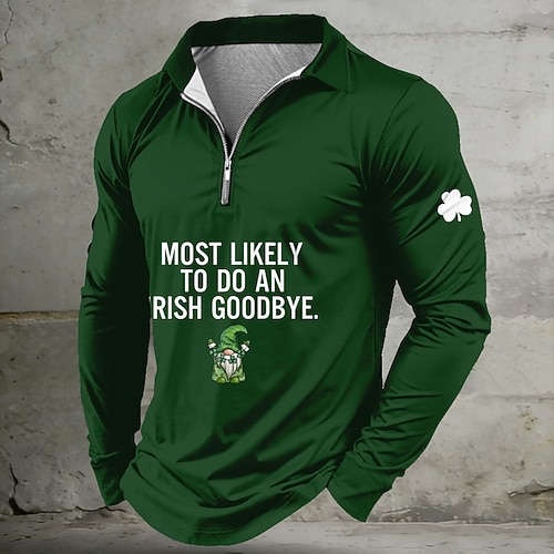 Magliette Polo a Zip da uomo per il Giorno di San Patrizio a maniche lunghe con colletto casual per festival all'aperto stampa 3D primavera autunno nero verde chiaro blu navy scuro