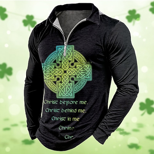Magliette Polo grafiche a Zip da uomo per il Giorno di San Patrizio a maniche lunghe con colletto casual per festival all'aperto stampa 3D primavera autunno nero 1