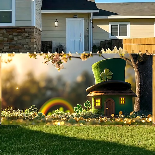striscione da giardino per il giorno di San Patrizio, decorazione per esterni, casa del folletto, trifoglio, moneta d'oro, copertura per recinzione, grande cartello da giardino, forniture per feste,