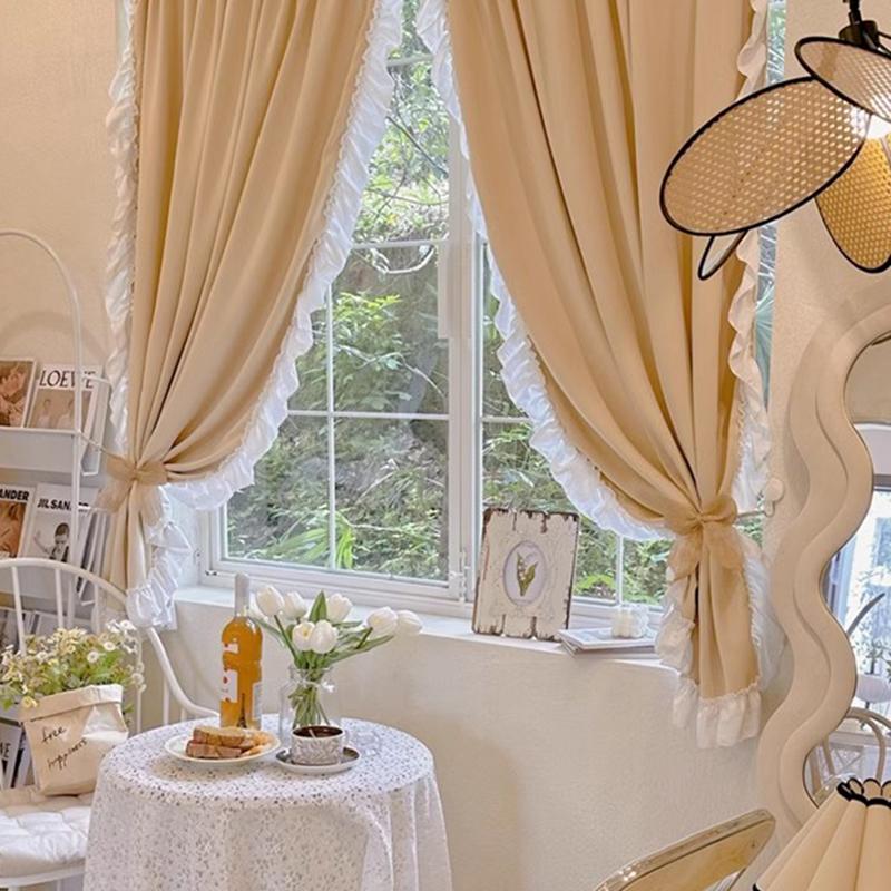 French Solid Color Retro Lace Curtain Rental House Bedroom Living Room Simple Curtain Full Blackout No-punch Easy Installation blue