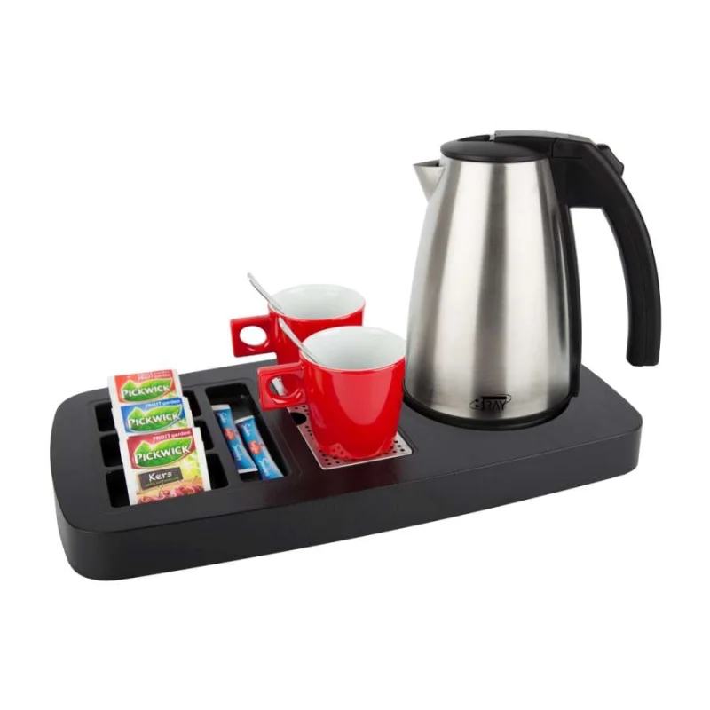 Willkommenstablett SENSE Schwarz mit Wasserkocher STYLE 1,0 L Edelstahl und 2 rote Porzellantassen