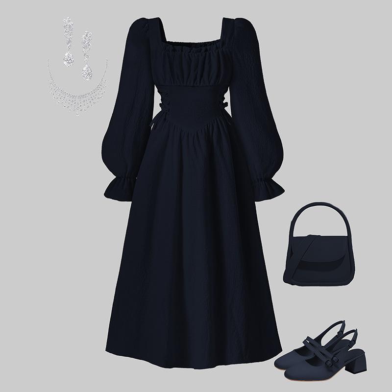 Children's Elegant Long-sleeved Square-neck Dress Spring and Summer Girls' Princess Dress 130cm dark brown