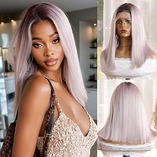Parrucca in pizzo sintetico Liscio Stile 12 pollice Colori Misti Riga centrale 13x4x1 T Parte Fronte in Pizzo Parrucca Per donna Parrucca Rosa chiaro