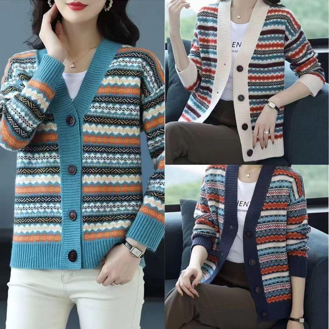 Striped Cashmere Cardigan Women's V-neck Casual Thick New Spring New Retro Jacquard Wool Sweater Knitted JSweater Jacket cm Dark blue