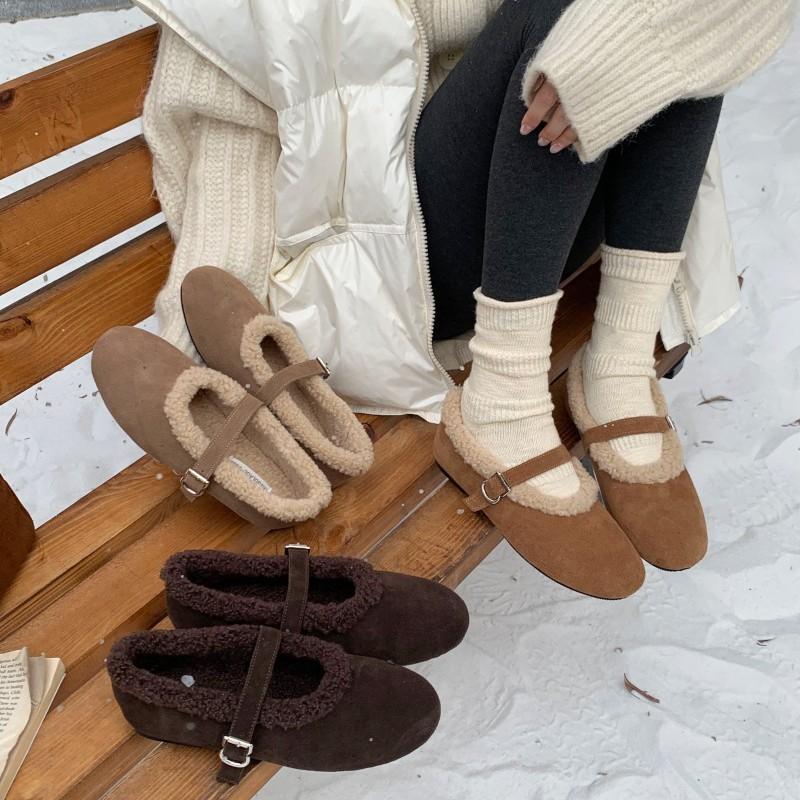 French inner thick-soled velvet Mary Jane fluffy shoes women's 2025 new winter retro warm one-word cotton shoes cm black