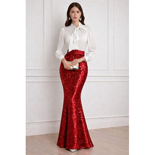 Sirena Tromba Lunghezza al pavimento Abito da Sera Elegante Scintillante Stile Celebrità Manica Lunga Collo Alto Festa in giardino Matrimonio Con Paillettes con Glitter