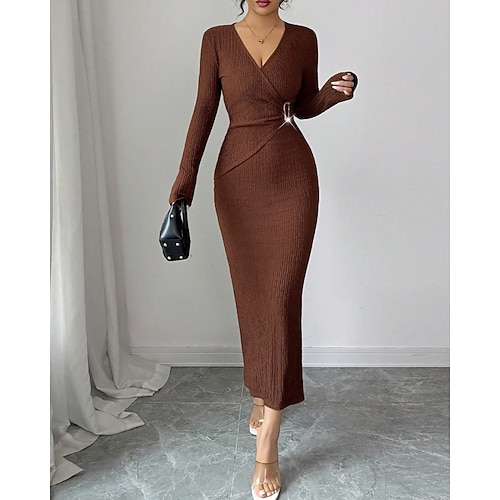 Per donna Abito Midi Tubino Moderno Vacanza Ferie Uscire Vestibilità regolare Semplice Manica Lunga Scollo a V Marrone Primavera Autunno Inverno