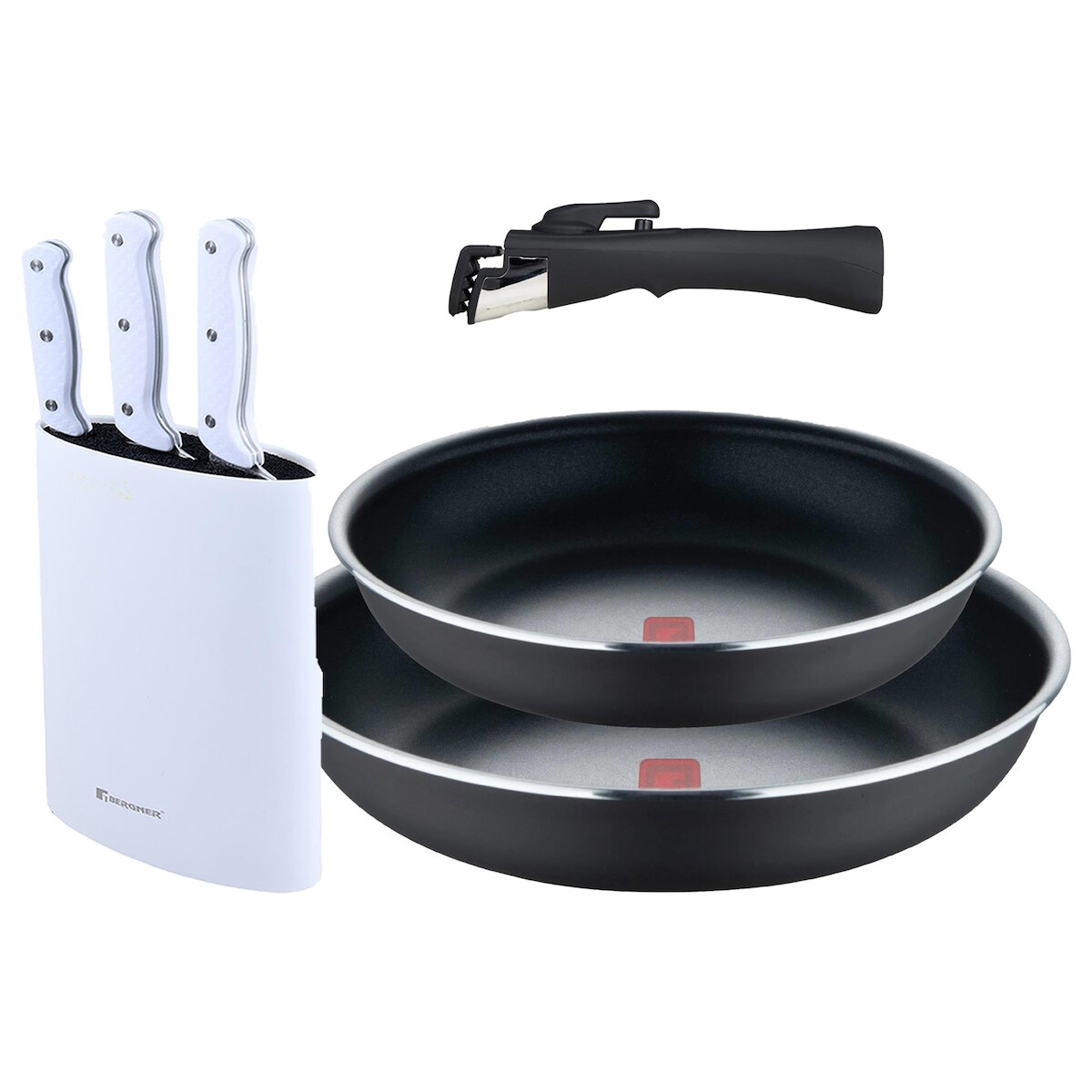 BERGNER - Set aus 2 Pfannen Ø24/28 cm aus gepresstem Aluminium mit Heat Dot, abnehmbarem Griff, 3-teiliger Messerset und Edelstahl-Tacoma