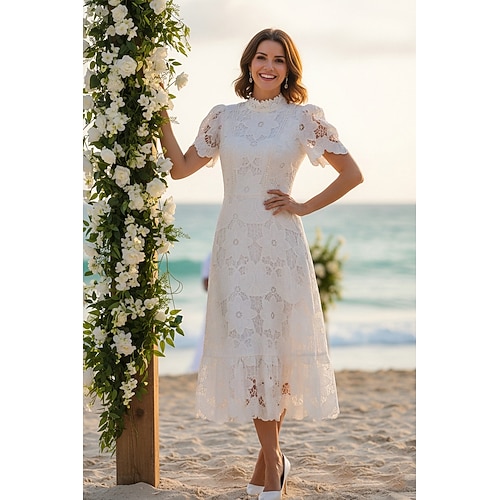 Linea ad A Lunghezza Tè Abito da Sposa in Pizzo Bianco Piccolo vestito bianco Elegante Piccoli Abiti Bianchi Manica Corta Collo Alto Matrimonio con Pizzo