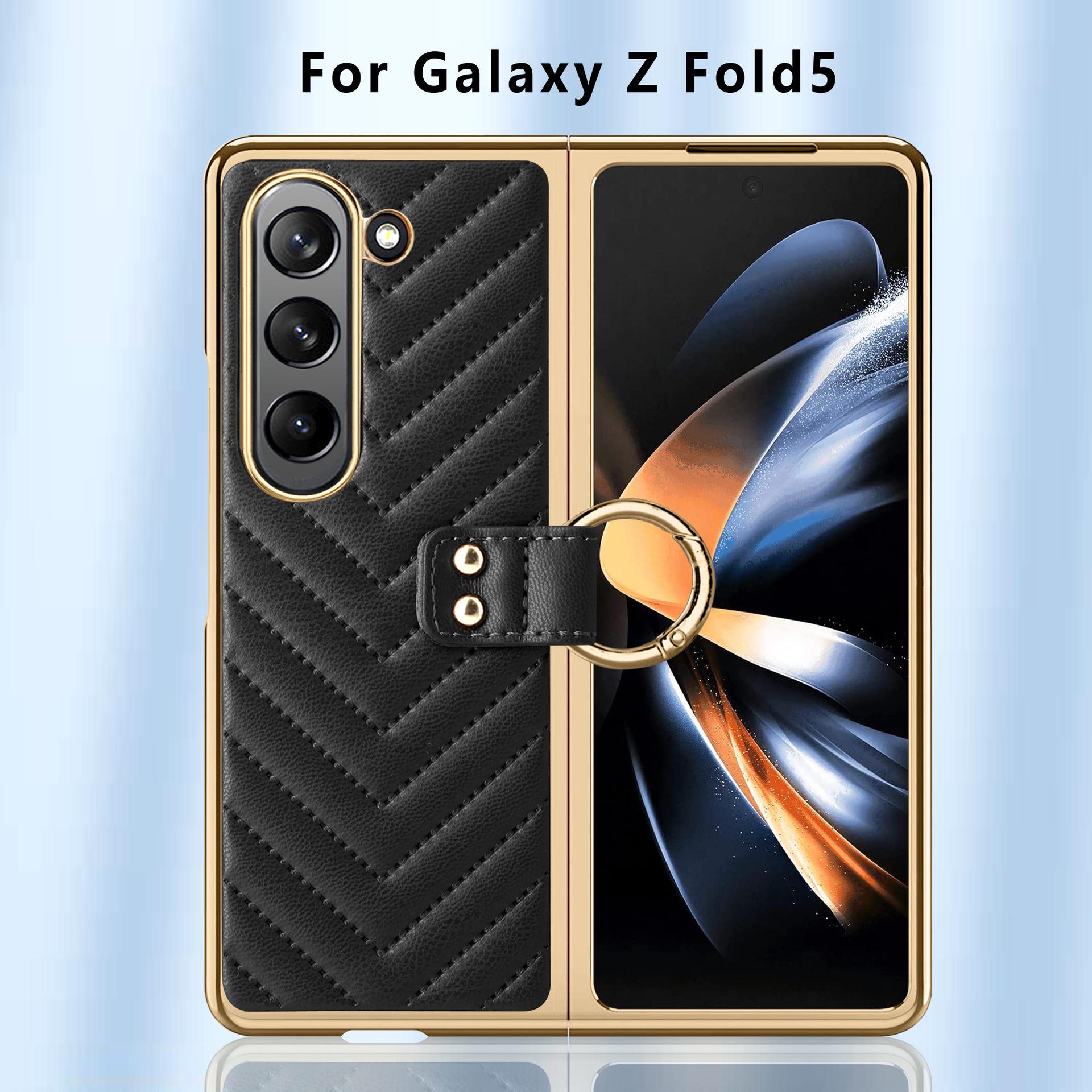 Samsung Z Fold7/6/5 PU Leder Flip Case mit platinierter Diamantgitter-Ringhalterung schwarz