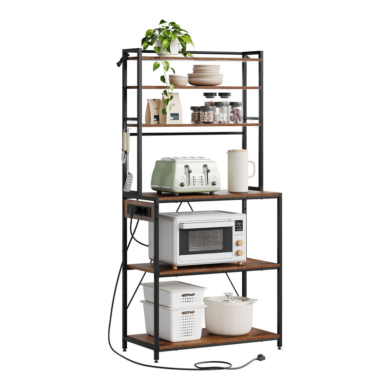 WOLTU Küchenregal mit Steckdosen, Mikrowellenständer mit 6 Regalen und 6 Haken, Aufbewahrungsregal für Küche Bad Wohnzimmer, Metall+Holz, Schwarz+Rustikal Braun, 80x39,5x167 cm