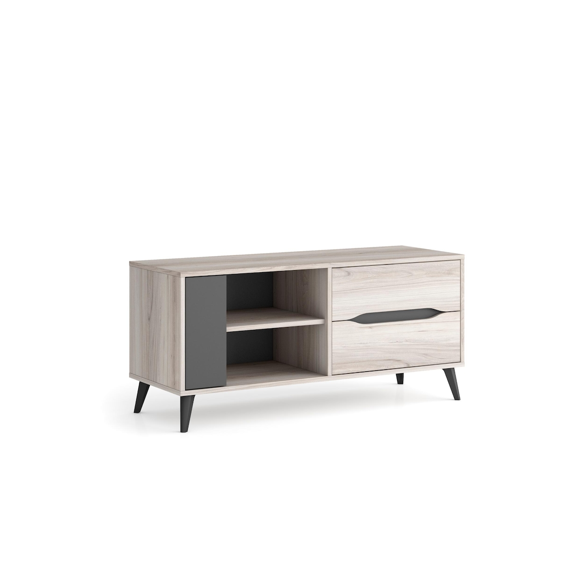 SKRAUT HOME TV-Schrank 110, 2 Schubladen + 1 Tür, Wohnzimmer, Modell KAI, Farbe: Eiche, Grau, 113x40x52cm Höhe _ TV110KAISHAPIZ