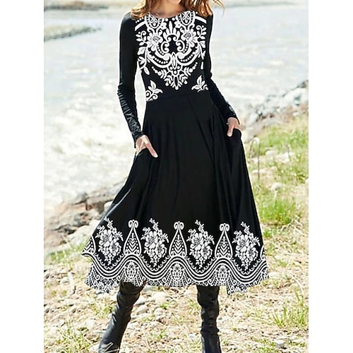 Per donna Abito Midi Abito a trapezio Abito aderente e svasato Vacanza Casual Quotidiano Vestibilità regolare Grafico Geometrico Manica Lunga Girocollo Nero Bianco Rosso Blu Estate Primavera Autunno