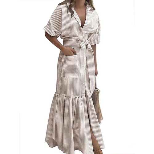 Per donna Abito Lungo Maxi Abito Abito Camicia Moderno Quotidiano All'aperto Vacanza Vestibilità regolare A righe Manica Corta Girocollo Colletto a Camicia Blu Magenta Nero Rosa Primavera Autunno