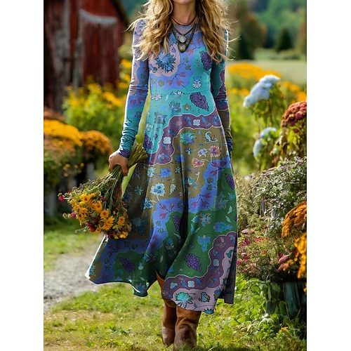 Per donna Abito maxi Abito a Tubino Abito a trapezio Festa Casual Boho Quotidiano Data Uscire Vestibilità regolare Floreale Grafico Tinta a nodi Manica Lunga Girocollo Verde chiaro Rosa Blu Viola