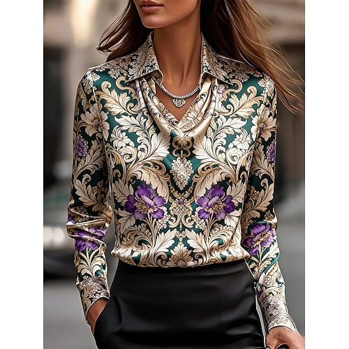 Per donna Camicia Floreale Grafico Elegante Casual Manica Lunga Scollo a Cascata Top Regolari Quotidiano Lavoro Ferie Stampato Drappeggiato Viola Primavera Autunno