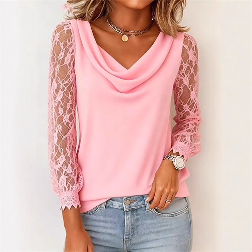 Per donna Blusa Top Eleganti Tinta unica Semplice Elegante Vintage Signore Manica Lunga Senza Spalle Top Regolari Quotidiano Lavoro Ferie Arricciato Pizzo Patchwork Nero Bianco Rosa Rosso Autunno