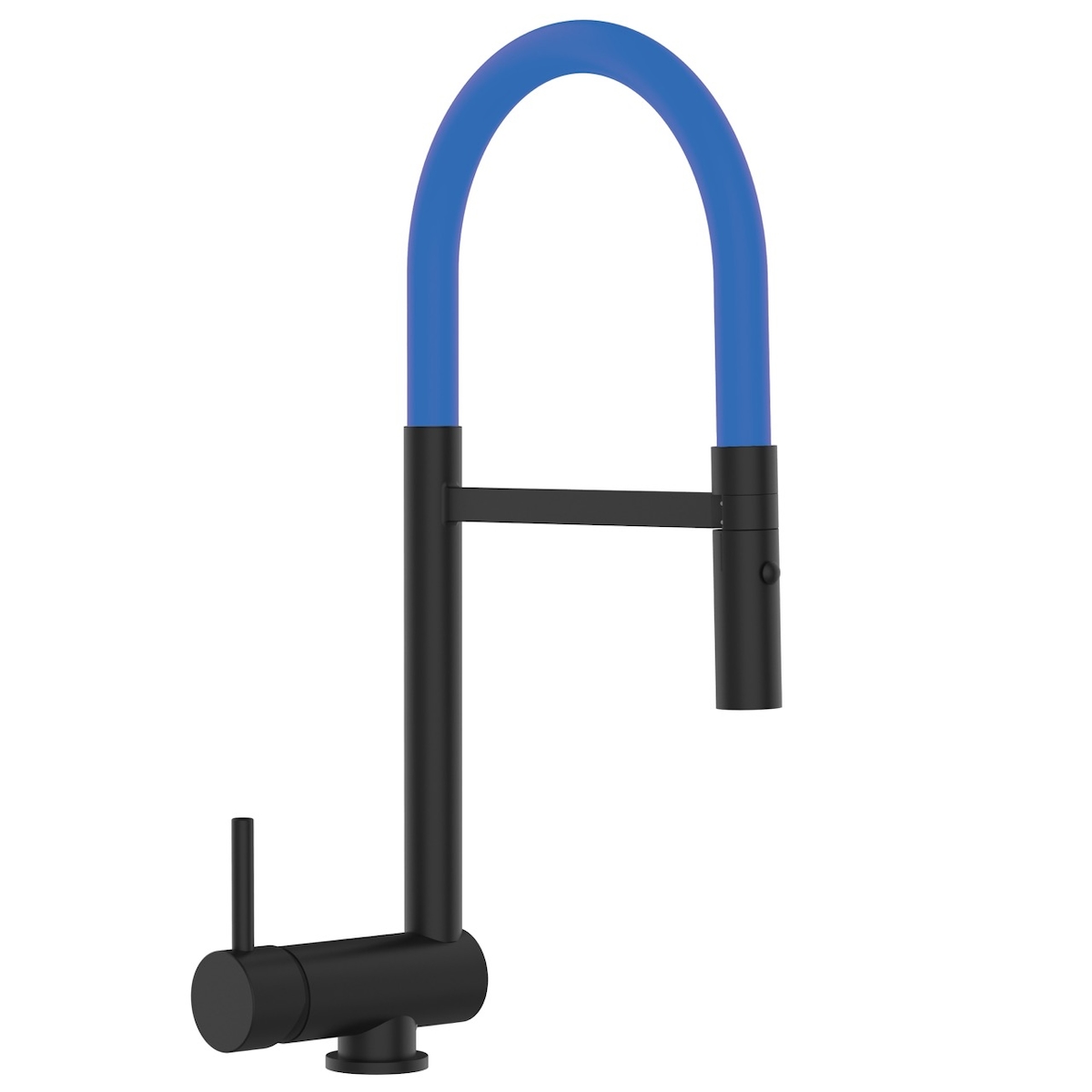 Vizio Unterfenster Wasserhahn Umklappbar 6 CM Schwarz Matt Küchenarmatur, 360° schwenkbarem Blau Auslauf und abnehmbare 2 Strahl Handbrause - LINKER HEBEL
