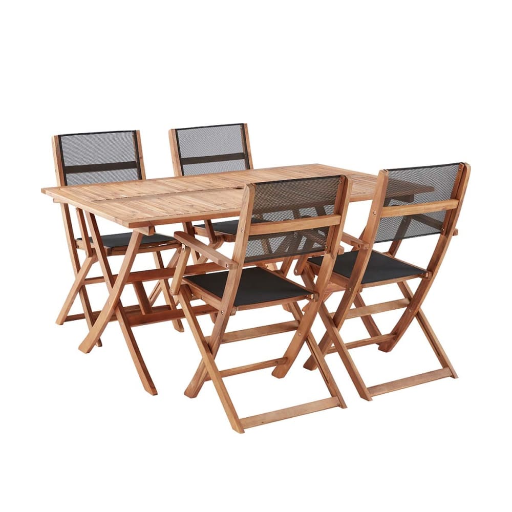 Set da esterno in massello di acacia e textilene nero per 4 persone