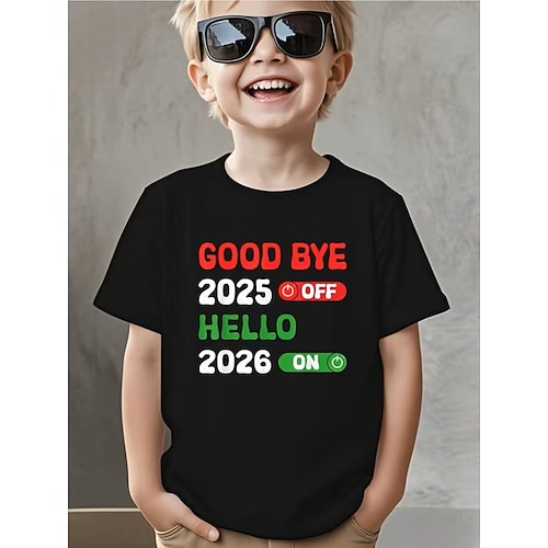 Maglietta nera per bambini e ragazzi, in cotone, per la festa di capodanno 2026, con numero, girocollo, manica corta, per attività all'aperto, abbigliamento quotidiano, moda, streetwear, stilista,